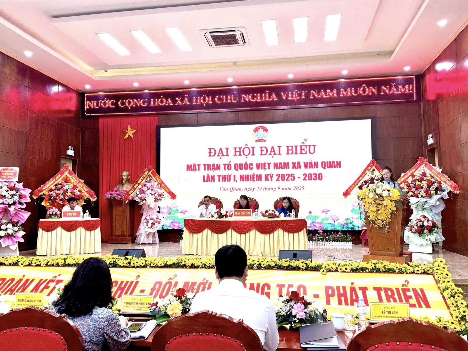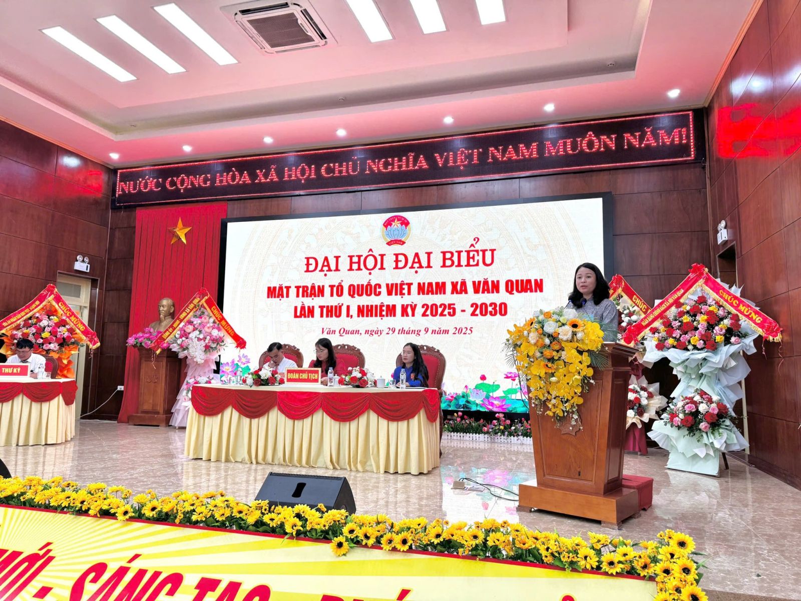 Ngày 29/9/2025, Ủy ban Mặt trận Tổ quốc Việt Nam xã Văn Quan đã long trọng tổ chức Đại hội đại biểu lần thứ I, nhiệm kỳ 2025 – 2030. Tham dự Đại hội có đồng chí Nguyễn Thị Hồng Vân – Tỉnh ủy viên, Phó Chủ tịch Ủy ban MTTQ Việt Nam tỉnh Lạng Sơn dự và chỉ đạo Đại hội; đồng chí Đường Ngọc Xuyên - Bí thư Đảng ủy xã Văn Quan, các đồng chí lãnh đạo thường trực Đảng ủy, HĐND, UBND xã; các đồng chí nguyên lãnh đạo Ủy ban MTTQ Việt Nam xã qua các thời kỳ hiện thường trú tại địa phương; đại biểu đại diện các phòng, ban, doanh nghiệp đóng trên địa bàn xã; đồng chí phóng viên các cơ quan thông tấn, báo chí của địa phương dự và đưa tin về Đại hội. Đặc biệt, Đại hội có sự tham dự của 123 đại biểu chính thức đại diện cho các tầng lớp nhân dân trong xã.