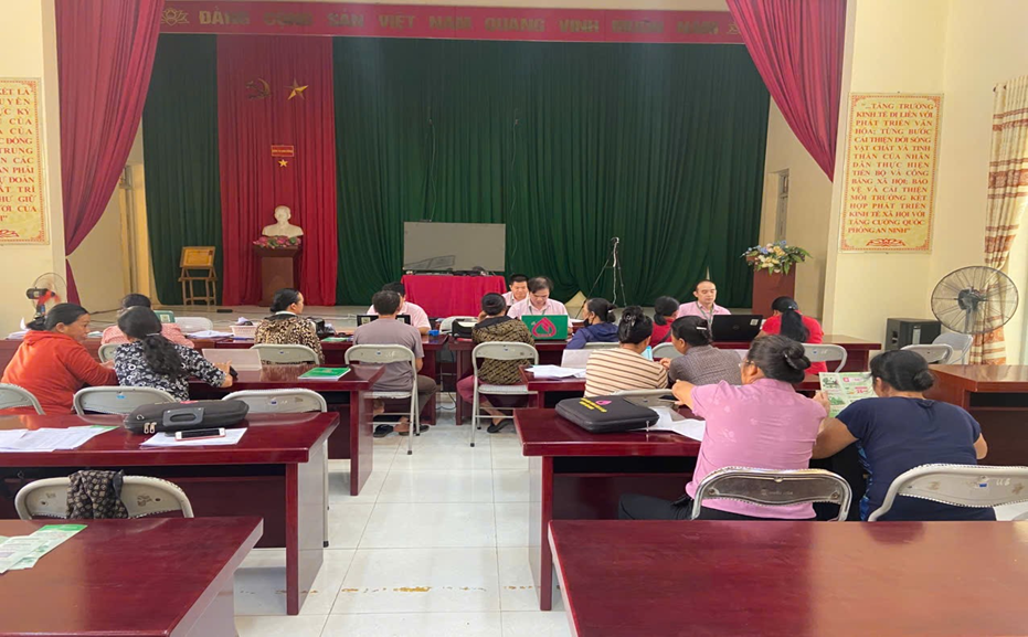 Cán bộ Phòng giao dịch NHCSXH Văn Quan triển khai, hướng dẫn khách hàng chuyển khoản trực tiếp từ tài khoản cá nhân tại NHCSXH để thanh toán trả nợ gốc và lãi khi đến han.
