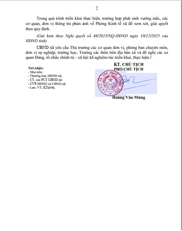 Ngày 10/12/2025, Hội đồng nhân dân tỉnh Lạng Sơn đã ban hành Nghị quyết số 48/2025/NQ-HĐND về Bảng giá đất lần đầu năm 2026 trên địa bàn tỉnh Lạng Sơn. Nghị quyết có hiệu lực thi hành kể từ ngày 01/01/2026. Để triển khai thực hiện Nghị quyết số 48/2025/NQ-HĐND và giải quyết các thủ tục hành chính về đất đai được bảo đảm thông suốt, hiệu quả; Ủy ban nhân dân xã Văn Quan yêu cầu các cơ quan, đơn vị thực hiện một số nội dung sau: