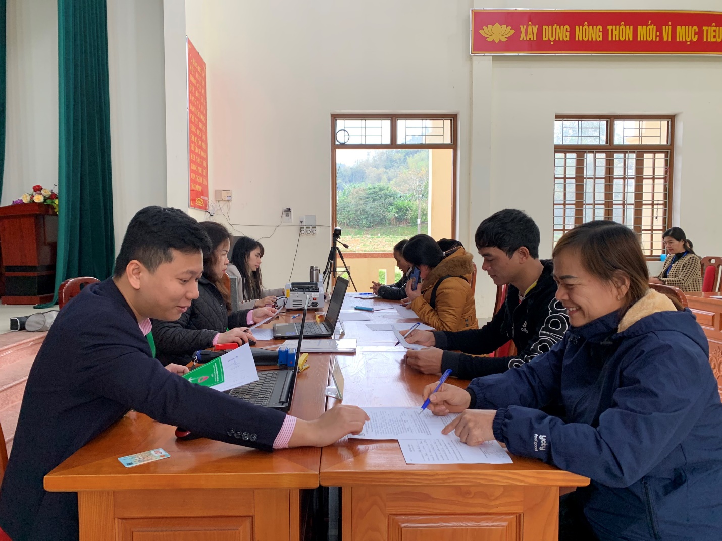 Cán bộ Phòng Giao dịch NHCSXH huyện Văn Quan hướng dẫn khách hàng mở tài khoản An sinh xã hội tại điểm giao dịch xã Tú Xuyên.